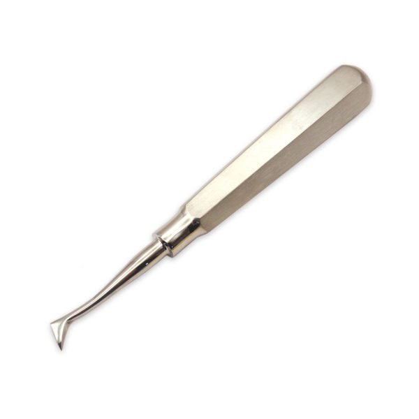 The Cryers Elevator has a triangular or curved blade that can fit into tight spaces around tooth roots and is used in Oral & Maxillofacial Surgery.